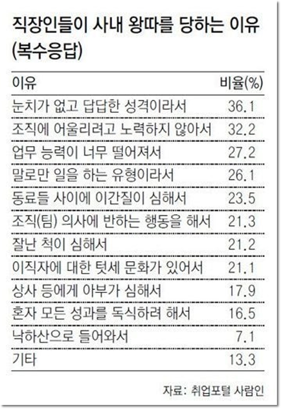"직장인들이 사내 왕따를 당하는 이유" 라는 주제로 모 커뮤니티에서 열띤 논쟁을 불러일으킨 적이 있었습니다.