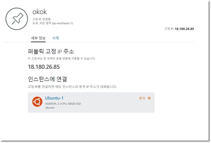 새로운 고정 ip를 생성할때 자동으로 도쿄 리전으로 고정 ip가 잡혀있을 겁니다.