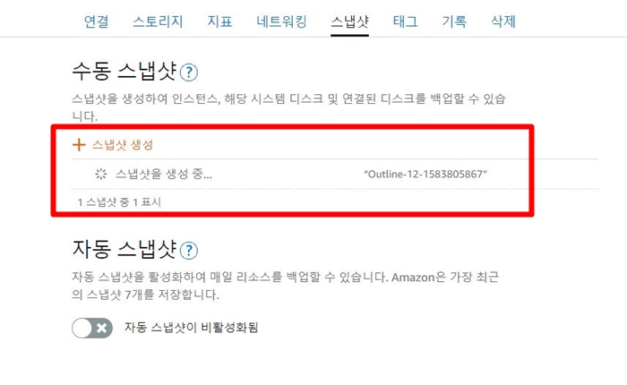 생성버튼을 클릭하시면 스냅샷이 만들어지기 시작합니다.