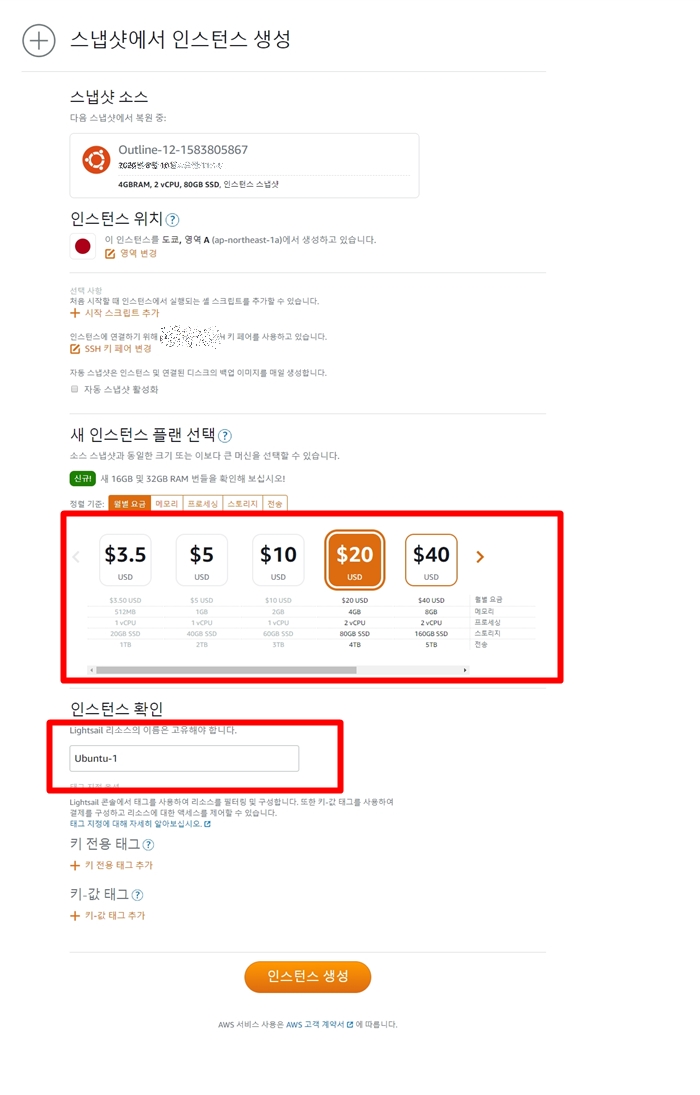 첫번째 빨간 네모 : 받아 놓은 스냅샷으로 새로운 인스턴스를 생성할 때 유의사항은 해당 스냅샷으로 받아 놓은 인스턴스 플랜 선택이 업그레이드는 되지만 다운그레이드는 안된다는 겁니다. 예를 들어, 내가 예전 야심차게 40달러 짜리로 인스턴스를 생성해서 스냅샷으로 받아 놓고, 아 내가 너무 비싼걸 선택했나? 해서 스냅샷에서 새 인스턴스를 생성할때 10달러 짜리로 선택해야지? 하지만 그것은 불가능 하다는 사실입니다. 선택 자체를 할 수가 없습니다. 왜요? 아마존은 돈을 벌어야 하기 때문이지요~ 이럴땐 진짜 소인배 아마존 같습니다. 보고있나? 아마존?