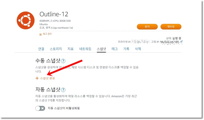본인의 인스턴스로 가서 스냅샷을 받아 놓습니다. ( 아래 이미지 참고 )