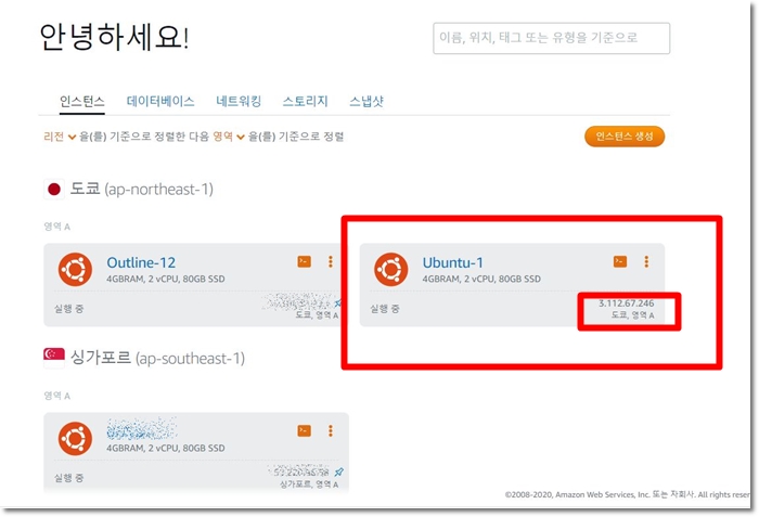 우측의 인스턴스를 잘 보시면 방금 태어난 따끈따끈한 아이피가 반짝이고 있쥬?