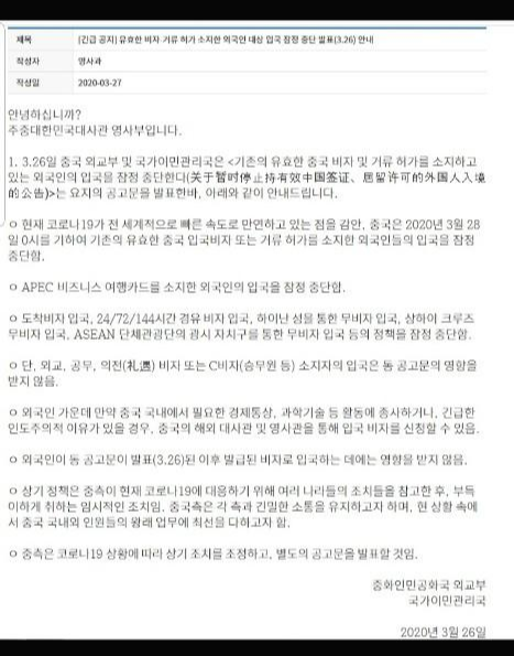 전에 올린 포스트의 내용과 같이, 2020년 3월 28일 0시를 기해 기존의 유효한 중국 입국비자 또는 거류 허가를 소지한 외국인들의 입국을 잠정 중단한다고 합니다.